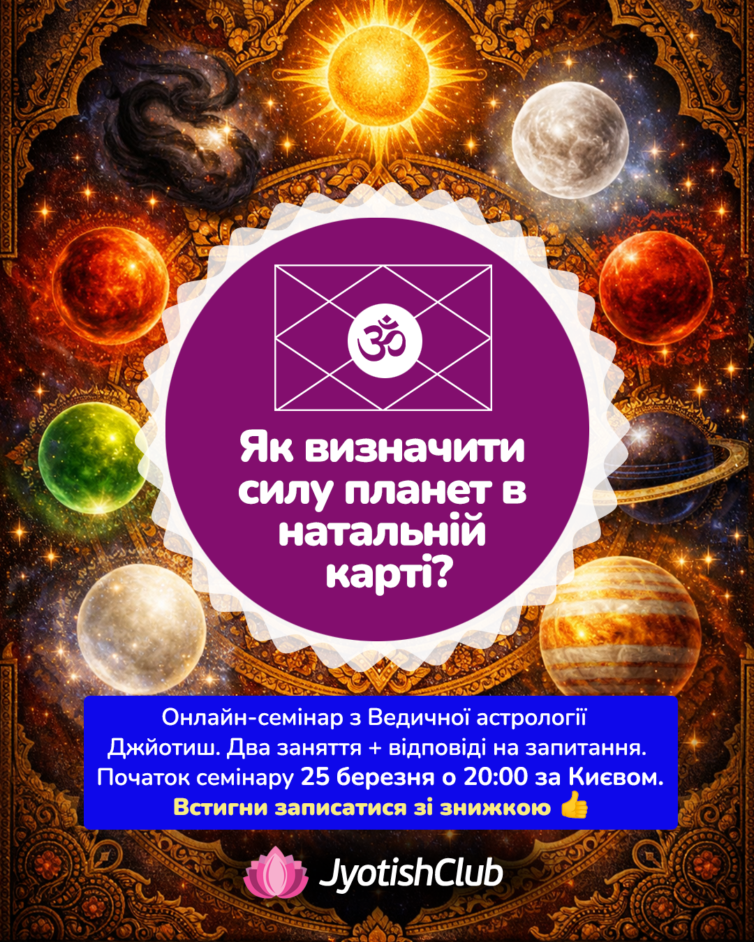 Друзі, запрошуємо вас на наш перший онлайн-семінар з Ведичної астрології Джйотиш: «Як визначити силу планет у натальній карті?». Ми вирішили провести цей семінар не випадково. Аналізуючи ваші запитання та спілкування з вами, ми помітили одну важливу річ:багато хто вже має базові знання з Джйотиш, але під час аналізу натальної карти виникає найскладніше завдання — як […]
